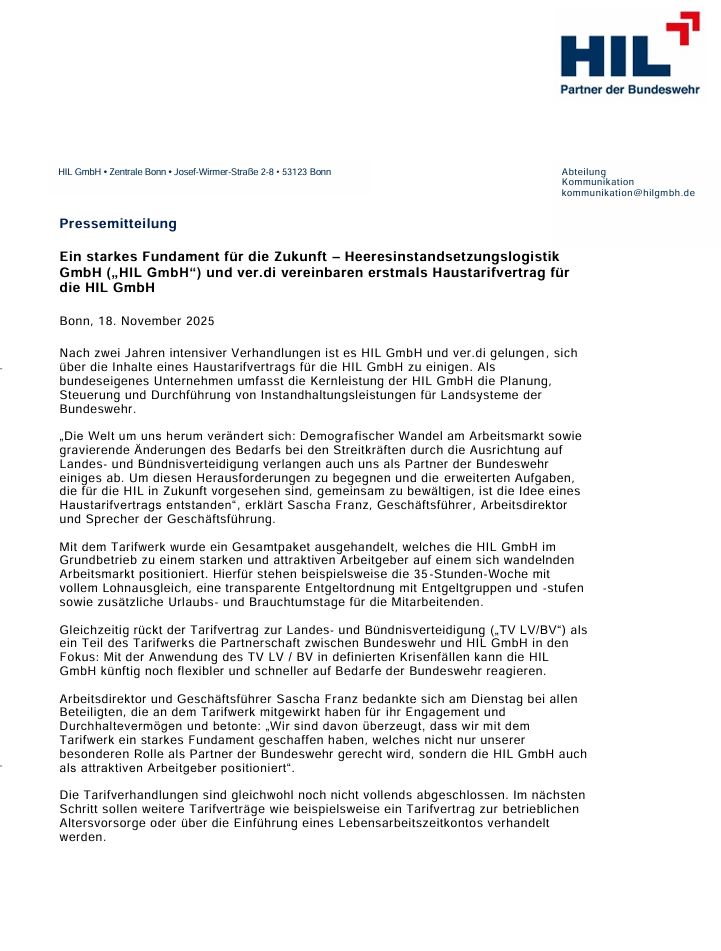 In der offiziellen Presseerklärung von ver.di unter der Überschrift „Finaler Durchbruch in den Verhandlungen“ heißt es dazu nur lapidar: „Zudem wurde sich auf einen Tarifvertrag zur Landes- und Bündnisverteidigung verständigt, der eine absolute Ausnahmesituation skizziert: Für den Fall, dass es einen Alarmbefehl der Bundeswehr durch den Bundesminister der Verteidigung geben sollte, kann in einzelnen Bereichen der HIL GmbH z.B. eine längere Arbeitszeit als 7 Stunden/ Tag, Wochenenddienste oder auch eine Urlaubssperre angeordnet werden. Die zusätzliche Arbeitszeit ist selbstverständlich zu vergüten und die Voraussetzungen für die Anordnung aufgrund eines Alarmbefehls sind sehr hoch.“