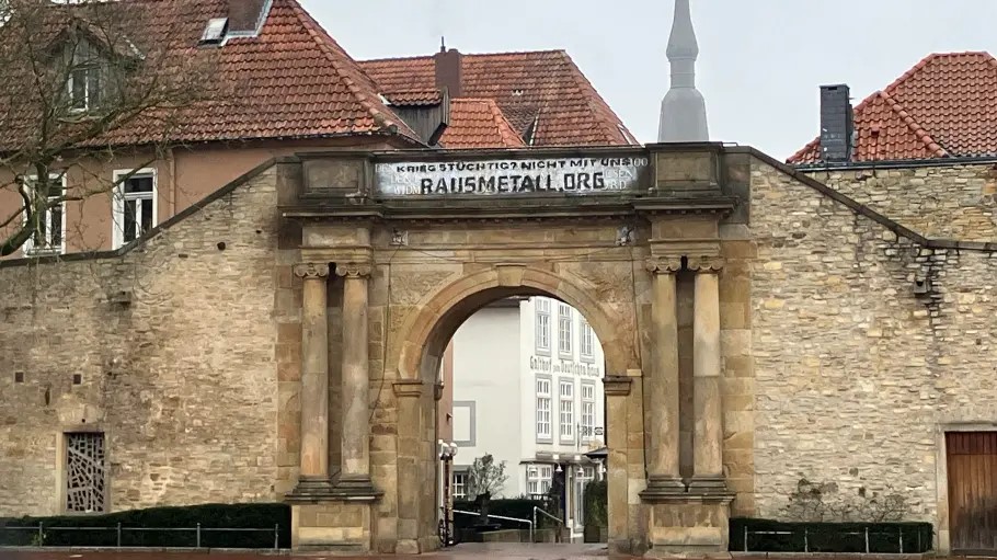 [1] Am 27. November berichtete die Neue Osnabrücker Zeitung unter der Überschrift `Staatsschutz ermittelt – Heger Tor beschmiert´über eine antimilitaristische Protestaktion am Osnabrücker Kriegerdenkmal „Heger Tor“, das mit einer klaren Anti-Aufrüstungsbotschaft versehen worden war. Auslöser der Aktion ist die Auseinandersetzung um die für Mitte 2027 drohende Schließung des VW-Werkes in Osnabrück mit mehr als 2.200 Beschäftigten – und die Debatte um eine mögliche militärische „Nachnutzung“ durch den Rüstungskonzern Rheinmetall. In kurzer Zeit entwickelte sich im Leserforum eine aggressive Welle der Empörung, die sich weniger gegen Aufrüstung, Militarisierung und Kriegsvorbereitung  als gegen den Protest selbst richtete. Auch eine Umfrage des Blattes zeigte den Ton der Debatte: Eine überdeutliche Mehrheit (94%) erklärte, die Aktion gehe „zu weit“, während nur ein verschwindend kleiner Teil den Protest für legitim hielt (4%) und sich weitere 2% keine Meinung dazu bilden wollten. Vor diesem Hintergrund wird sichtbar, was antimilitaristischer Widerstand im Deutschland der Zeitenwende inzwischen bedeutet: Er stört nicht nur – er gilt als die Friedhofsruhe störende und damit „zersetzende“ Provokation, die mit den Mitteln des Staatsschutzes verfolgt wird und zum Schweigen gebracht werden soll .
